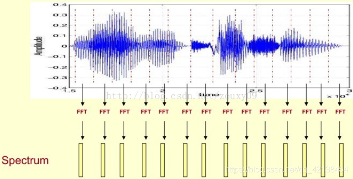 这样我们会得到一个随着时间变化的频谱图,这个就是描述语音信号的spectrogram声谱图。